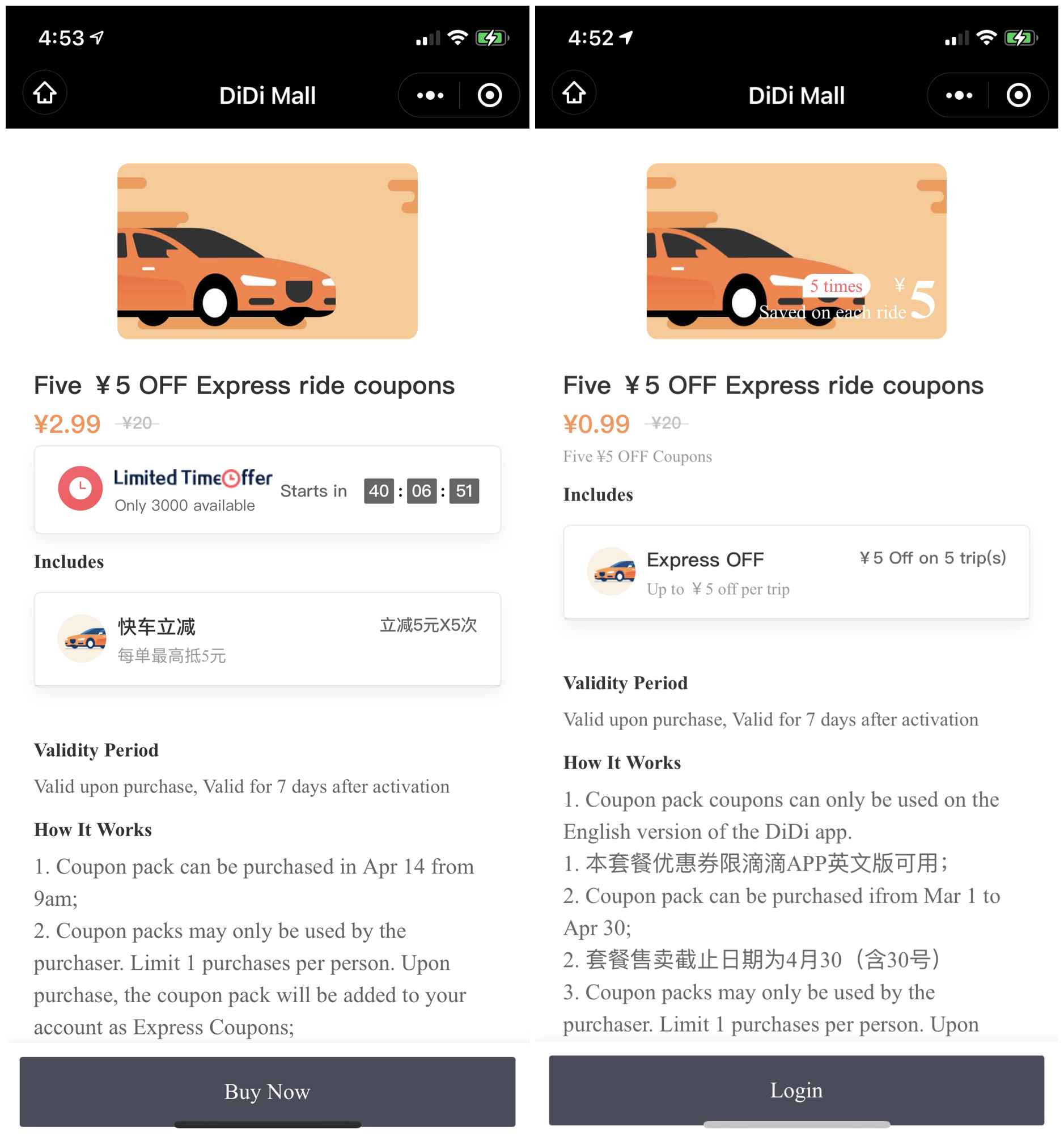 之前小编也发布过 0.99元购买5张5元滴滴快车无门槛立减券 又新增一个2.99元购买5张5元券,等于自己花2.99+0.99元一共可以购买5张10元无门槛打车券,购买后有效期7天;如果暂时不需要的可以先收藏起来,等用的时候再买,还是一样需要切换英文版可使用。
