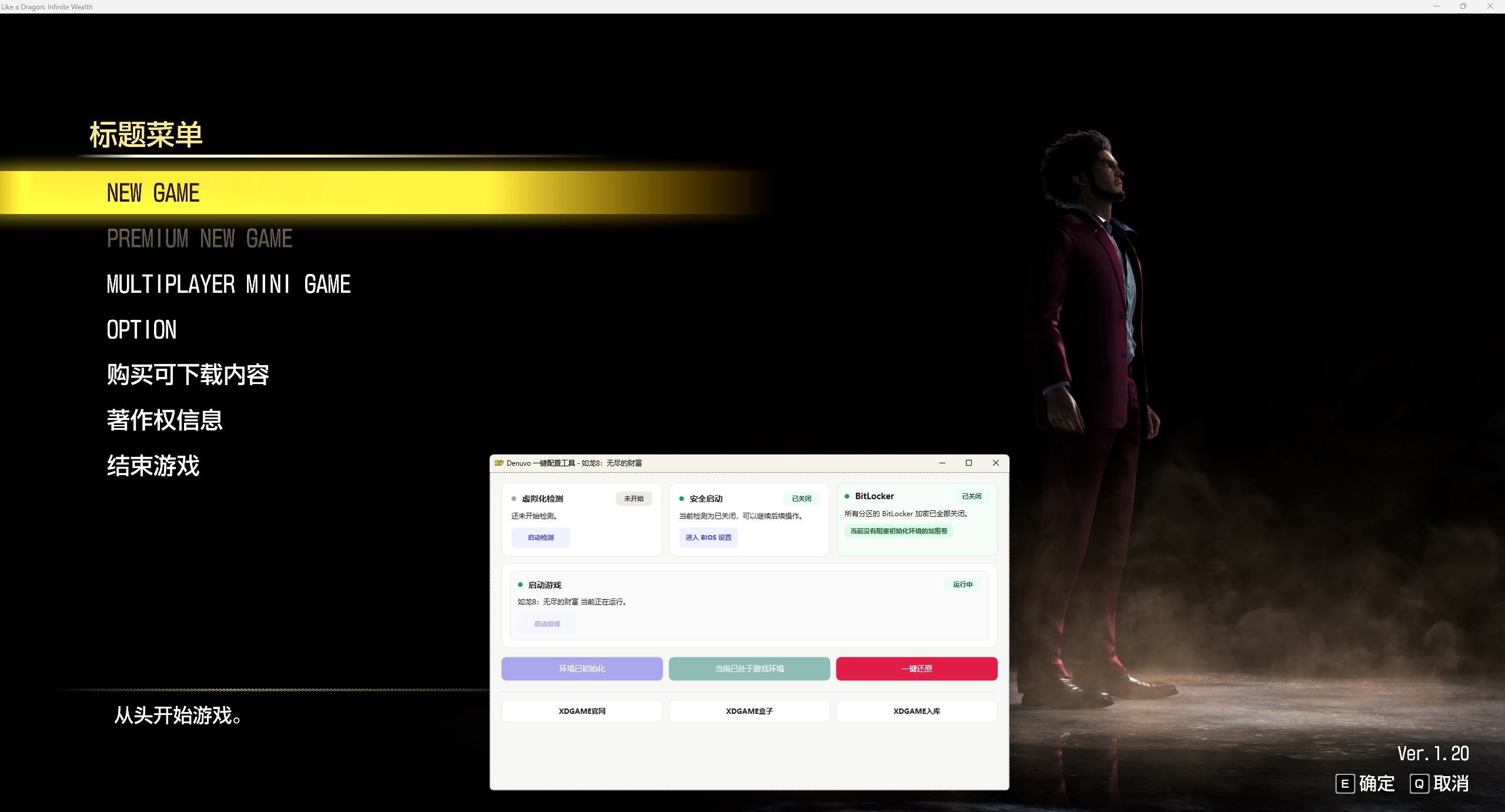从“人生低谷”东山再起的男人——春日一番,与面临“人生最后”之战的男人——桐生一马,两位主角共同演绎的超大作 RPG,带来系列至高的感人故事。战斗进化为更具策略性的“动态指令 RPG 战斗”,而舞台则首度移师异国他乡的“夏威夷”。尽情玩转各色夏威夷独有的娱乐场所,书写属于你的热血篇章吧! 虚拟工具还在待成熟阶段(兼容程度不够,但未必不能玩)虚拟机只是用来绕D密,所以玩起来和正常版基本没差,几乎没有性能损耗。 没动手能力嫌麻烦不建议搞(其实也没想象那么麻烦),不过你真的能搞懂,D加密游戏有相关补丁全都是可以玩的。 Q1:会不会搞坏电脑 A:不保证所有人硬件都兼容都能玩,考虑清楚在下!部分人存在一定蓝屏/死机/损坏系统风险!玩不了就删不提供任何折腾帮助! Q2:游戏会不会很卡,容易闪退 A:虚拟机仅用来绕D密,几乎不占用性能。这些大作要求配置较高,有些优化也一般,(能玩情况下)如果闪退,你玩正版极大概率也会闪退 Q3:有些游戏个别CPU玩不了吗? A:最近更新的游戏补丁,大部分都能玩,之前游戏的补丁作者也一直更新测试中,这是虚拟机正在迈向成熟阶段。同个补丁同个游戏,也有可能你的硬件能玩,别人的硬件不能玩,所以考虑清楚在下。 打开游戏之前的环境准备(所有人都必须做 只需要做一次 后续畅玩所有D加密游戏) 进入主板bios设置 1. 开启虚拟化: 找到 SVM Mode (AMD) 或 Intel Virtualization Technology (Intel),设置为 Enabled。 2.关闭安全启动: 找到 Secure Boot,设置为 Disabled。 注:每个主板具体设置不同 不知道设置可以百度查询或问豆包自己主板型号的相关设置 以上都完成后:打开Denuvo.exe 检查第一排设置是否都已经完成 都显示小绿点代表以上步骤完成 都显示小绿点代表完成,我们点击软件的初始化,然后重启电脑【开机时点F7 或 手动选择禁用驱动程序强制签名】 重启电脑后继续打开Denuvo.exe点击 启动游戏 → 开始玩耍 ↓ 站长亲测截图 ↓ v1.20(Build.17233673)|容量78.3GB|官方简体中文|支持键盘.鼠标.手柄游戏介绍