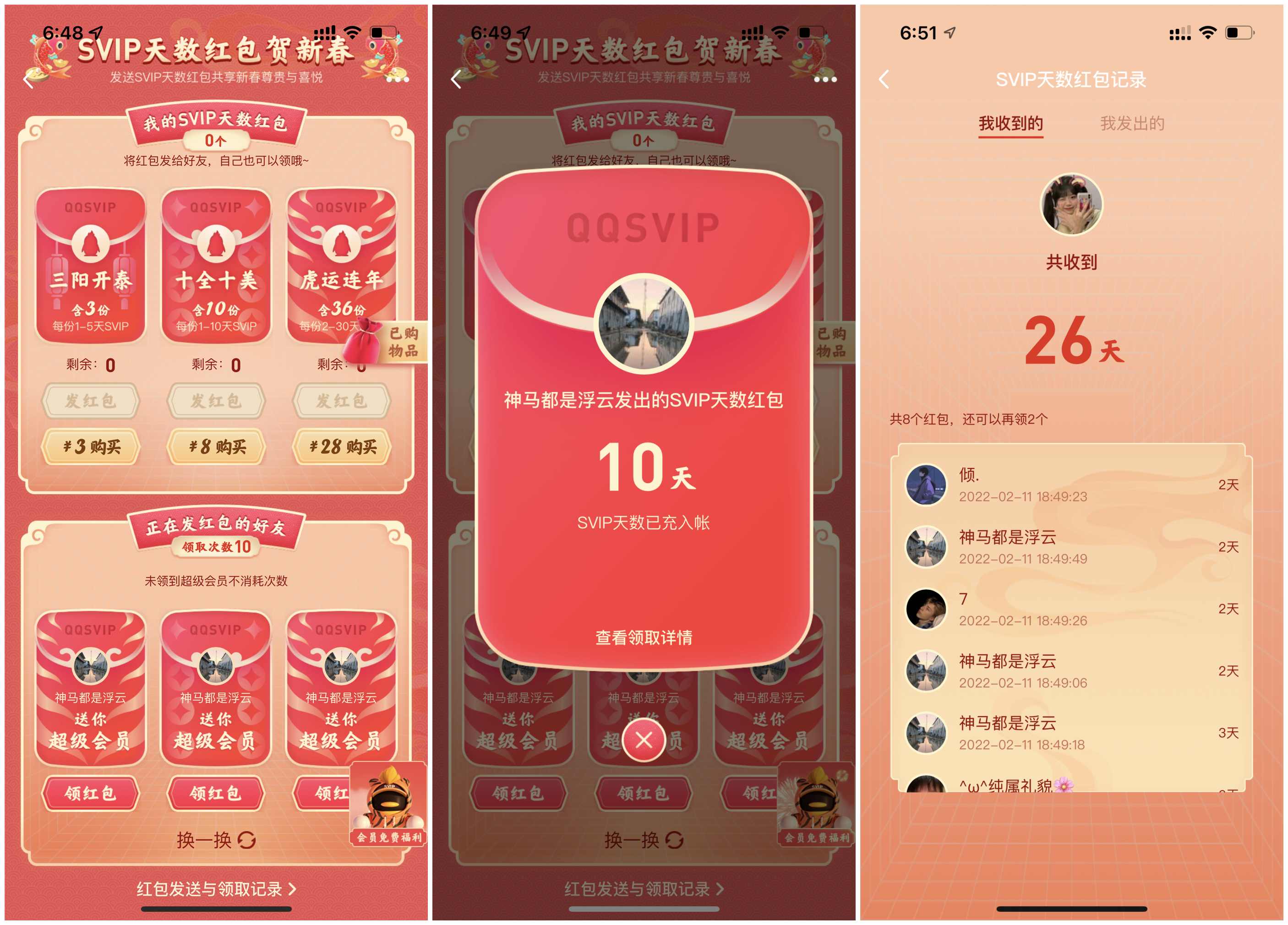 本文是进入活动可以看到正在发红包的好友,如果没有就过一段时间再看;每人可以领取10次,未领取到超级会员不消耗次数,小编一共领了8次获得26天SVIP;还可以120Q币购买1年超级会员,包含36份红包,每份红包包含2-30天SVIP。