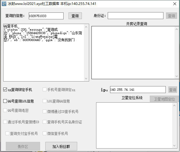 冰封查Q绑多功功能社工助手十一实用的工具,软件内含QQ查询绑定手机、QQ号查询LOL信息等功能,需要的小伙伴下载使用即可!注:软件内含收费功能,站长没有测试,各位请勿充值,点击右下角免费使用即可!